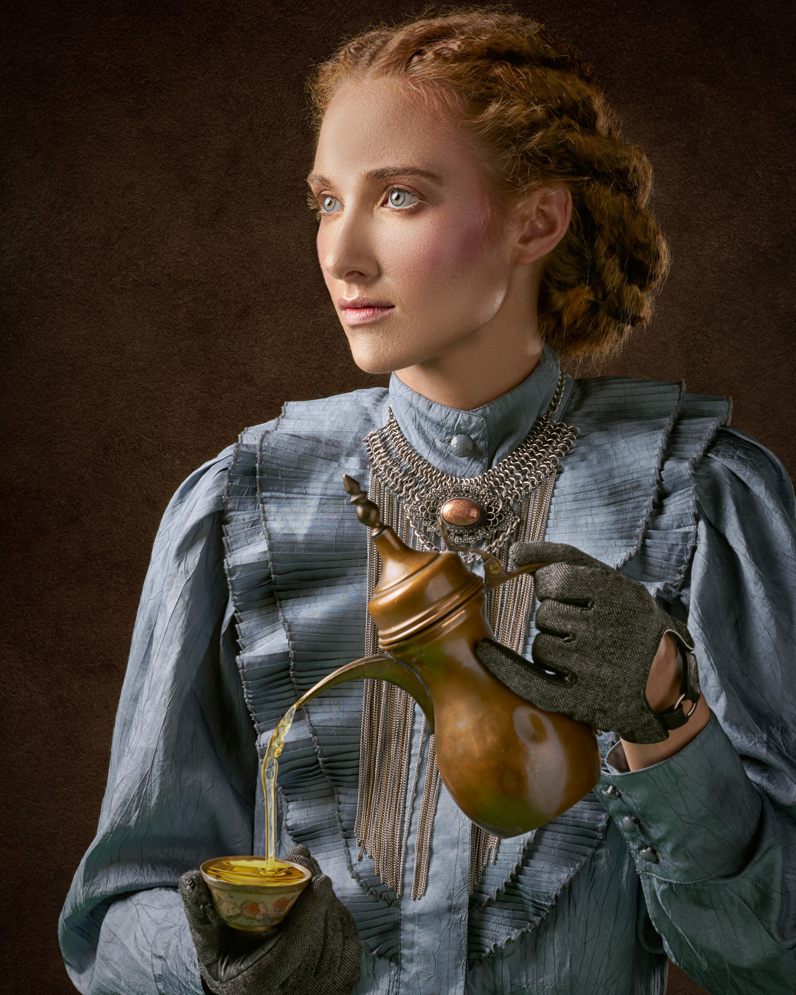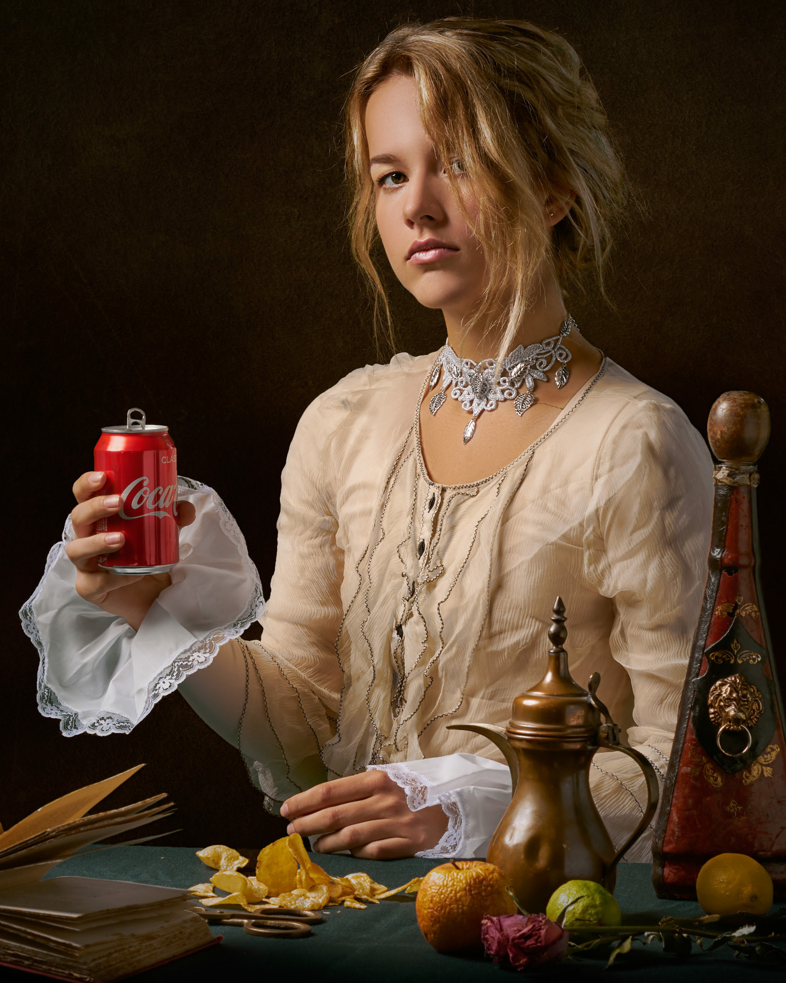For several years I focused on refining this distinctive lighting style, deliberately styling my sitters to echo the mood and compositional weight of classical portraiture. Simple props and modest costumes, sometimes no more than a bathrobe, were used to evoke painterly restraint, while at other times the illusion was intentionally disrupted by the introduction of contemporary elements, such as a can of Coke. These subtle interventions allowed the images to operate as tongue-in-cheek commentaries on the reverence often afforded to classical painting.