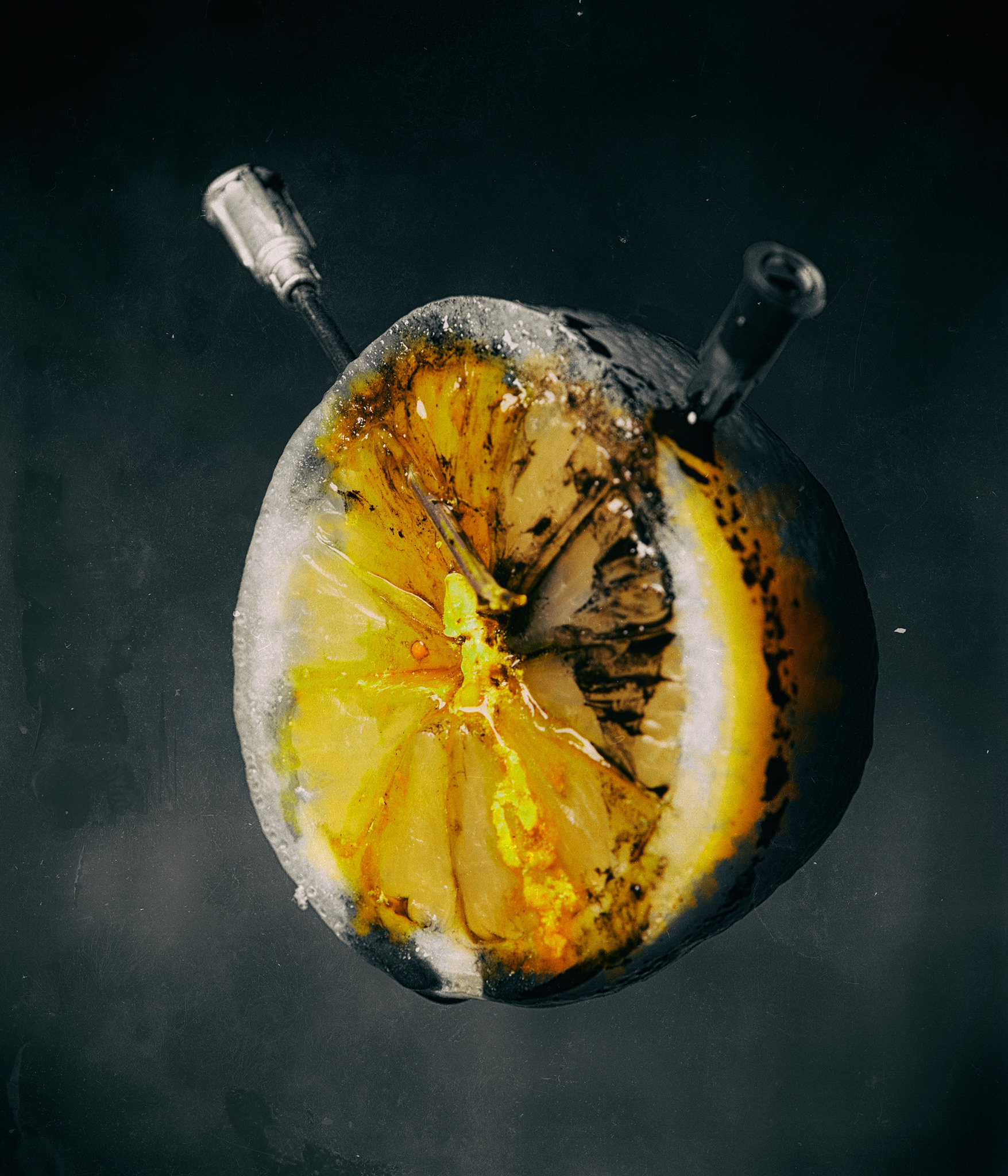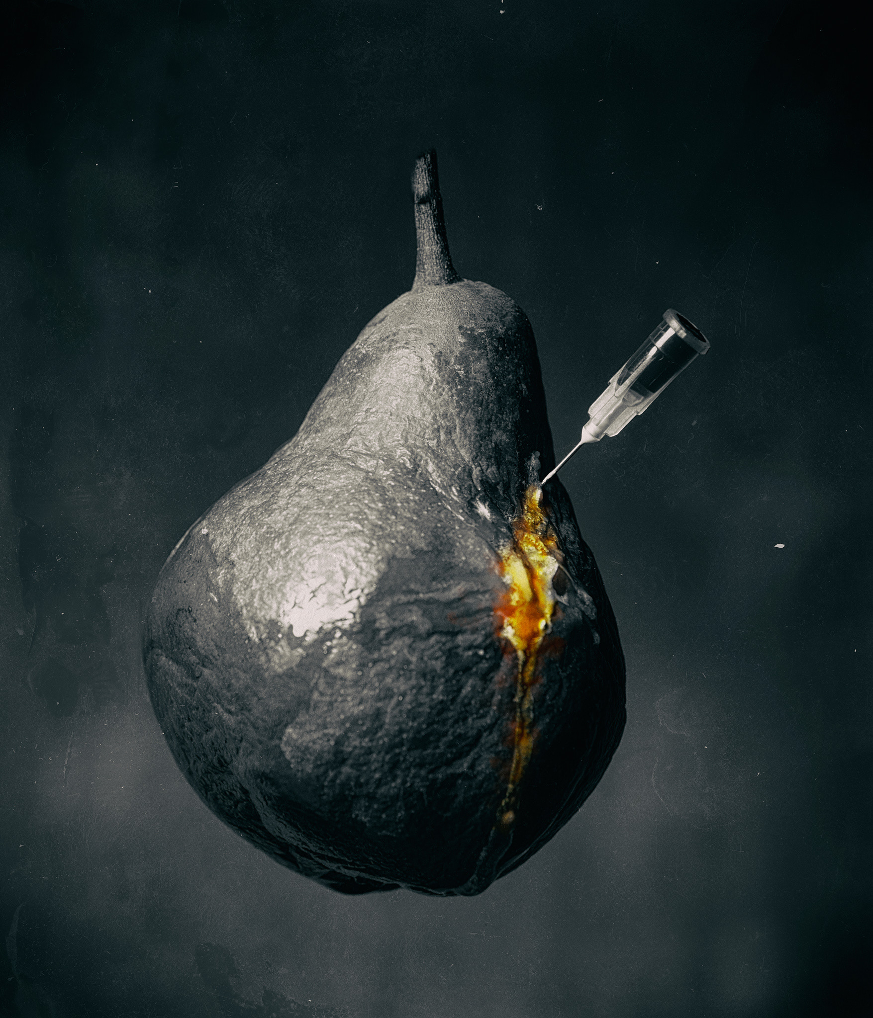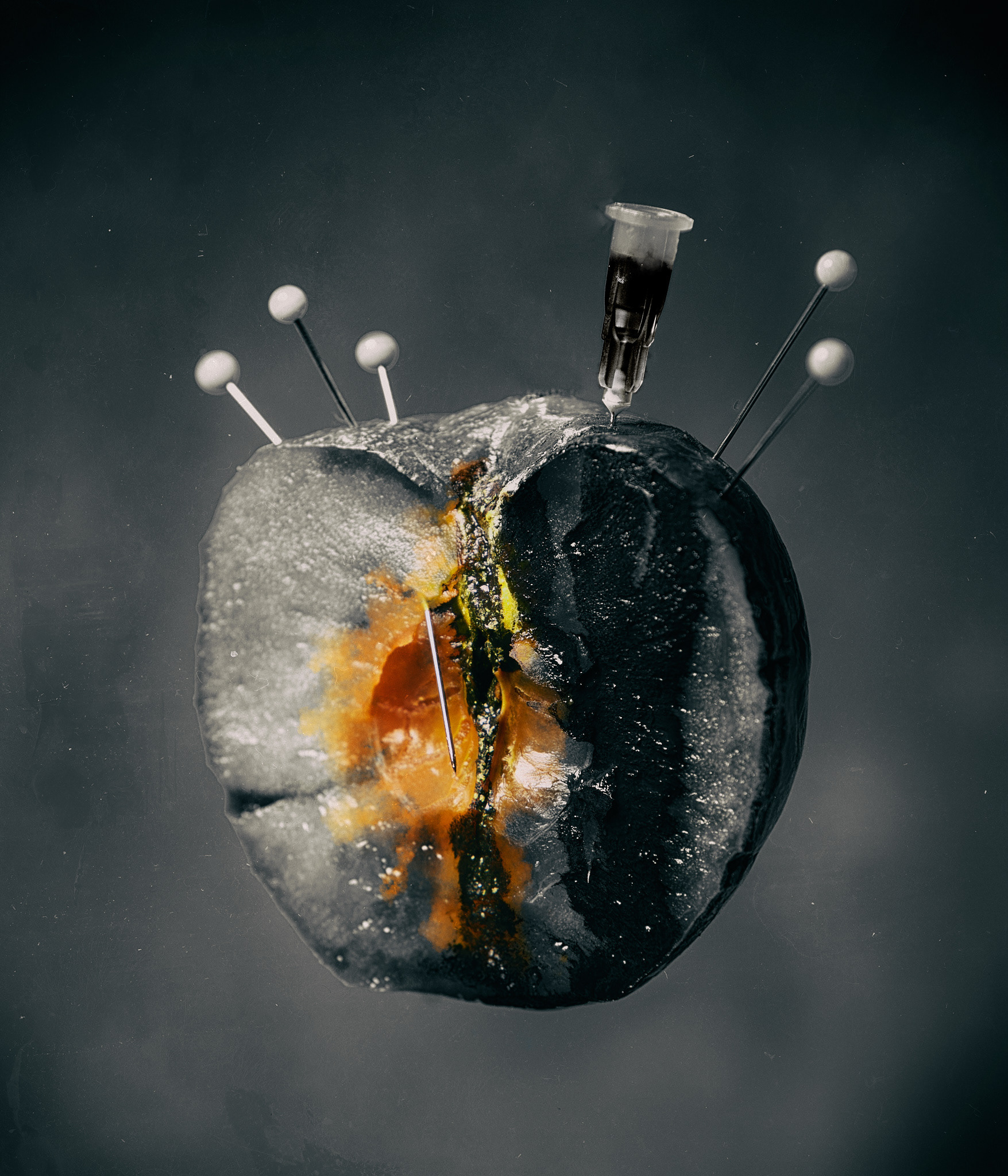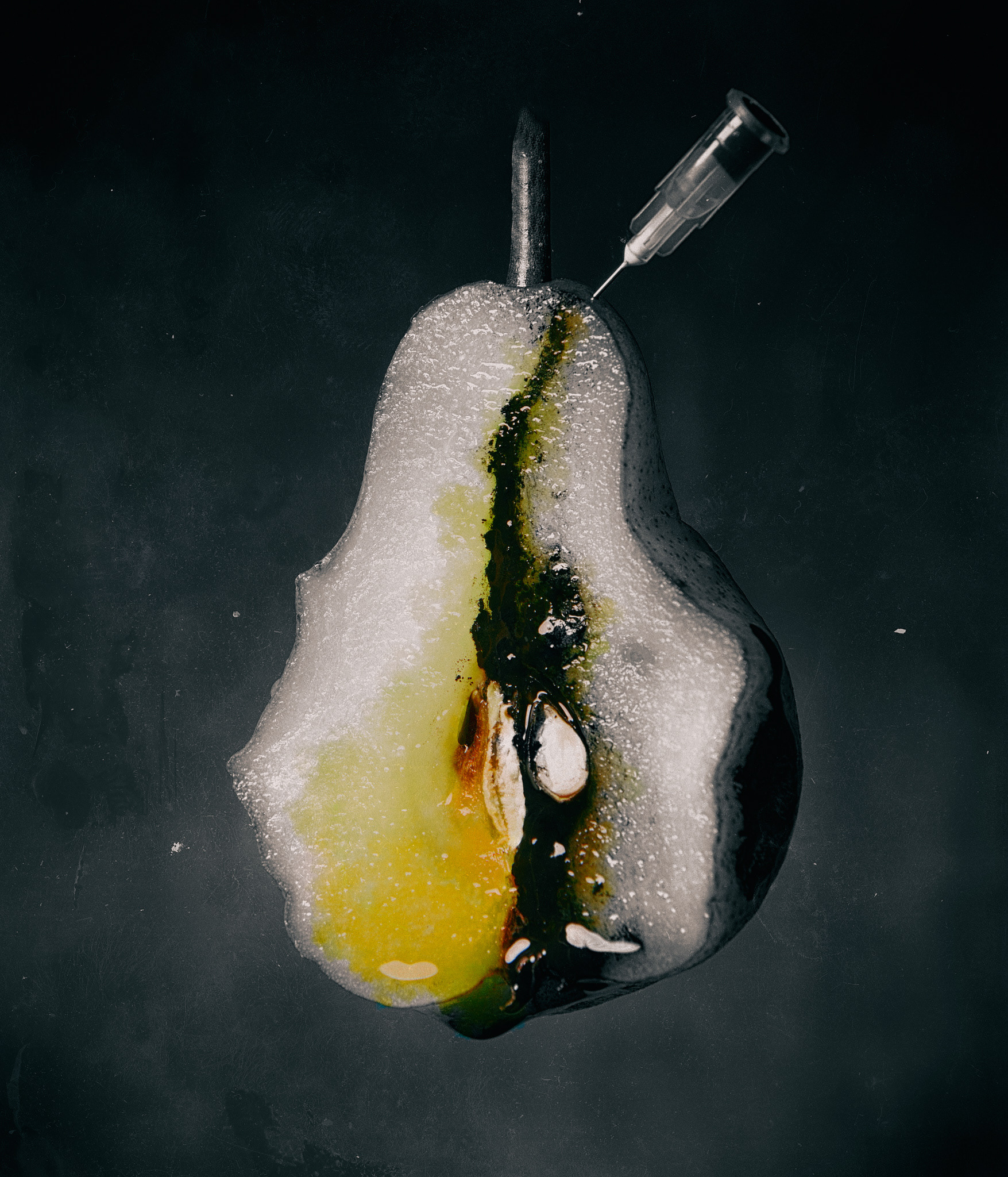 The Cure is a photographic project that explores fragility, deterioration, and the uneasy paradox of treatment. I photographed fruits and vegetables at various stages of freshness, from ripe to decaying, subjecting them to repeated injections of non-organic fluids. What might initially resemble an act of preservation gradually becomes an intrusion, accelerating their decline rather than preventing it.